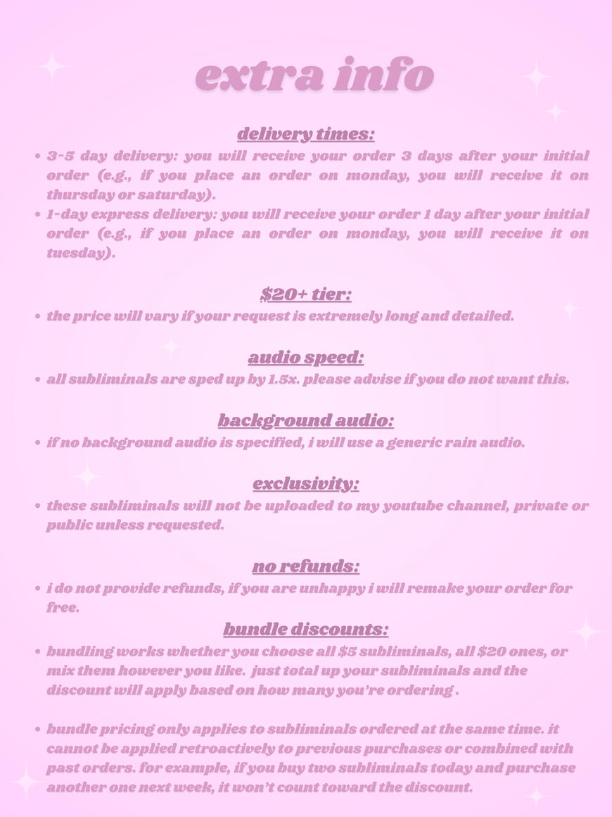 yes. i will not cover: race/ethnicity changing, anything that’s harmful or discriminatory towards any group, skin color subliminals, extreme or underground topics (like mental illness, self-harm, harm to others, etc), or anything that’s morally questionable. if you’re not sure whether it crosses a line, i probably won’t do it. however, you're feel free to ask me beforehand if you’re unsure whether a topic is too extreme.that said — i’m always down for unique or fun requests. you want butterfly wings? a unicorn aura? a secret superpower? i got you.can i bundle, speed up, or download your subliminals?